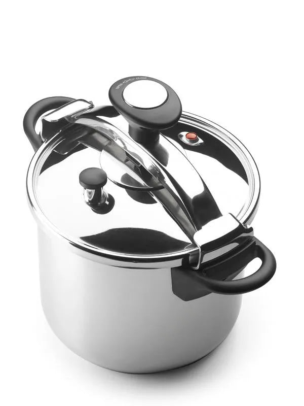 6-liter capacity for everyday recipes. Highly durable traditional pot with a knob closure and basic safety valve. Suitable for induction , ceramic, gas, and electric cooktops. Made of high-pressure-resistant stainless steel.