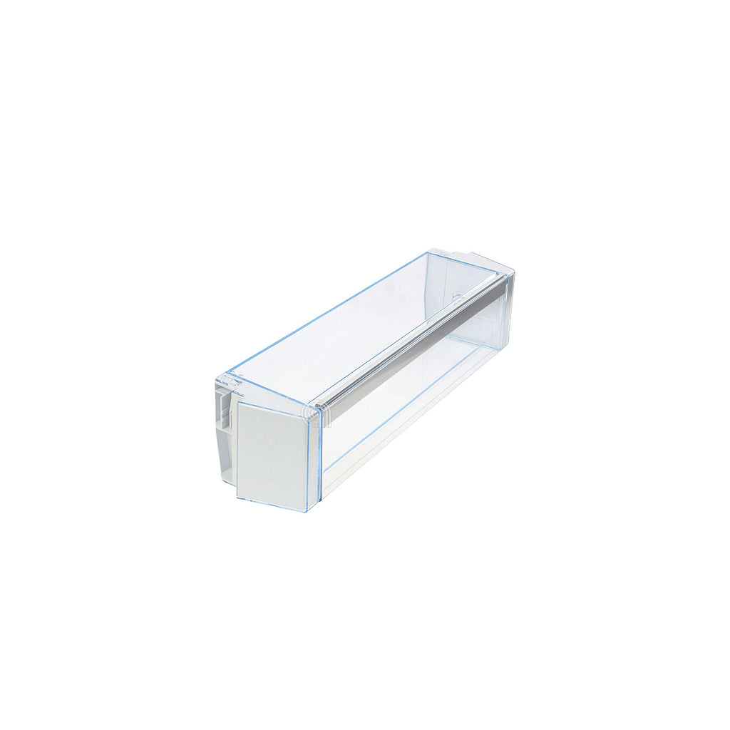Este balcón original para nevera Bosch es un repuesto diseñado para sustituir la bandeja o estante frontal interno de frigoríficos, permitiendo almacenar botellas, frascos o alimentos pequeños de forma segura y ordenada.