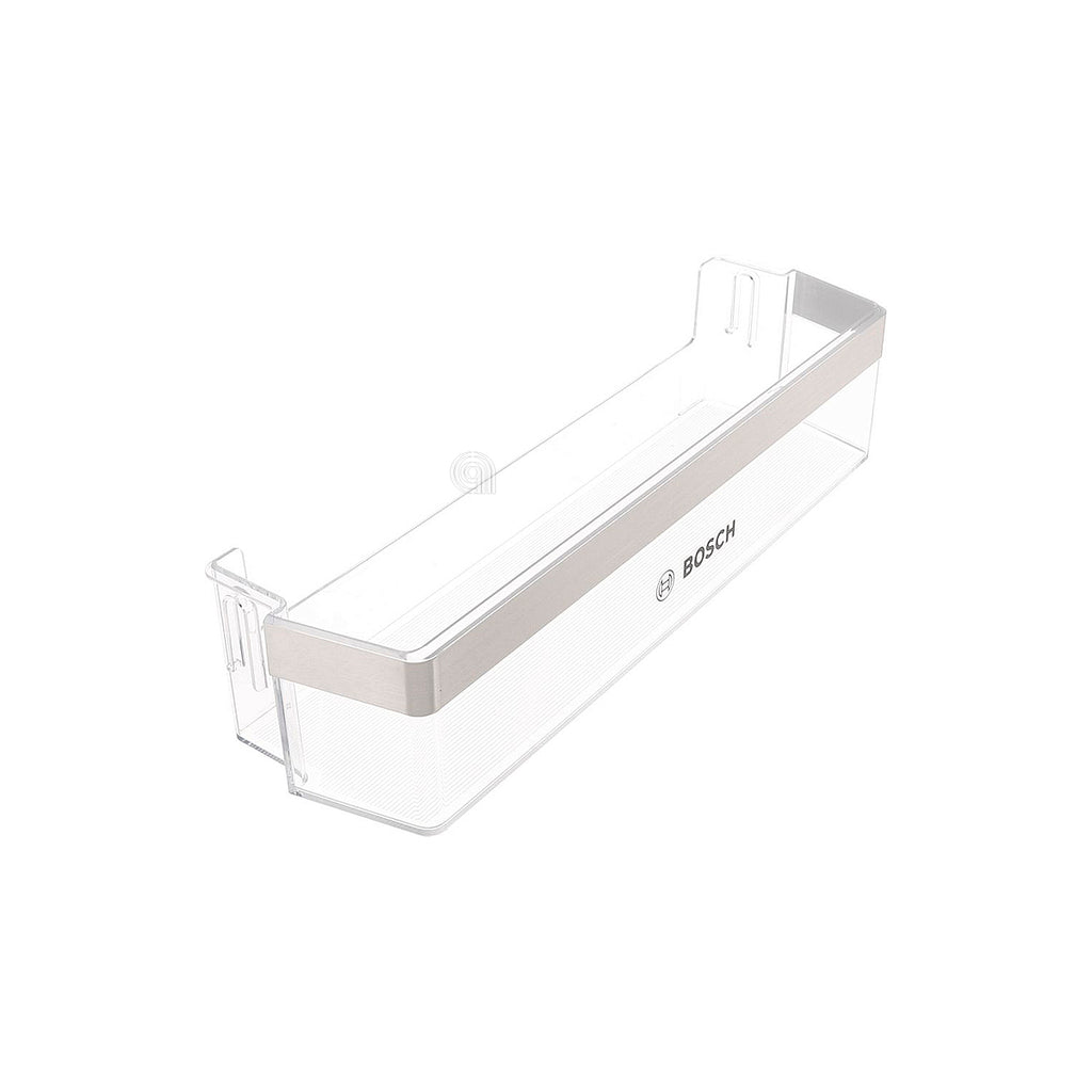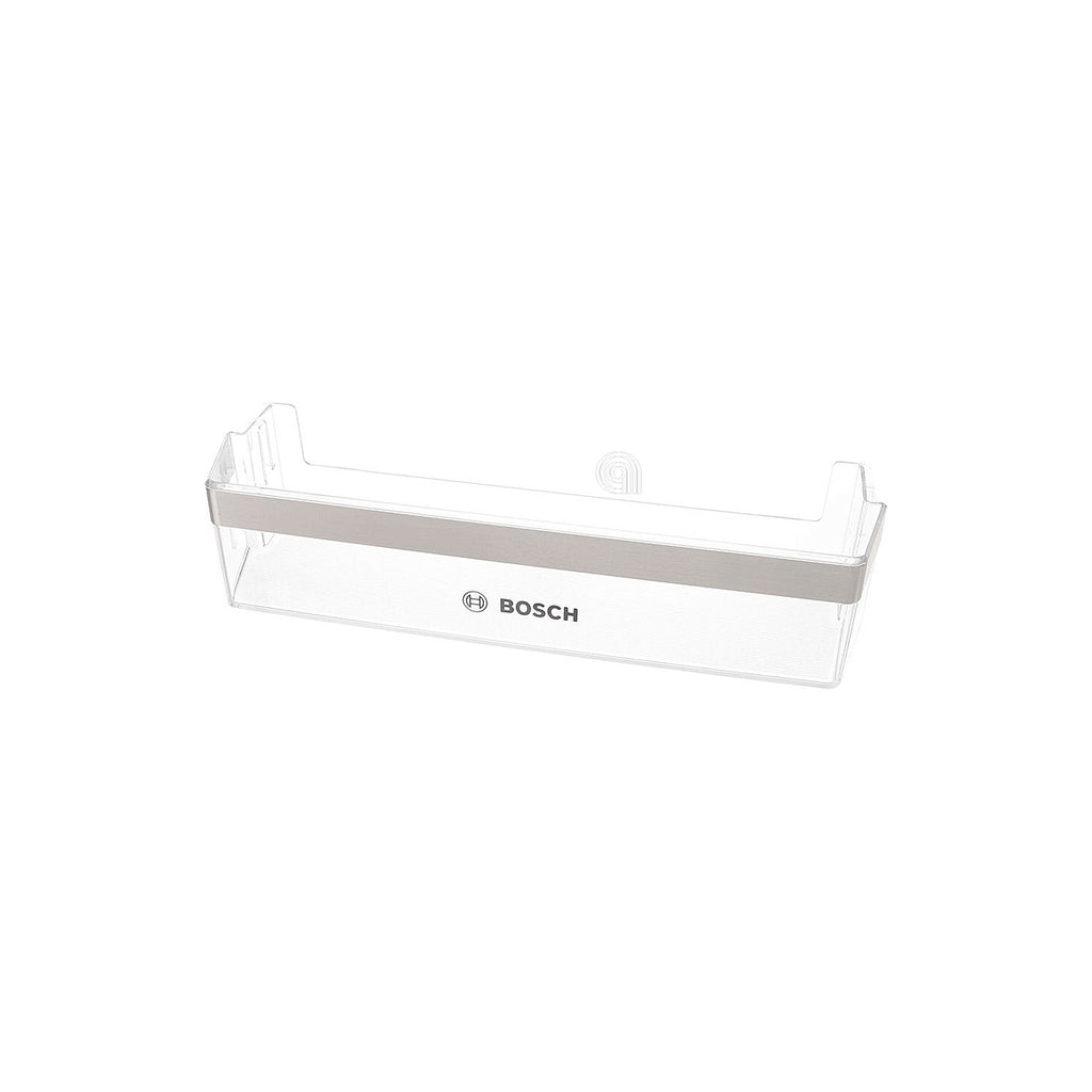 El balconcino es un estante o bandeja interior diseñado para frigoríficos, que se instala en la puerta para almacenar botellas, envases y otros alimentos. Este recambio es compatible con frigoríficos Bosch y permite mantener organizada y accesible la zona de almacenaje en la puerta del frigorífico.