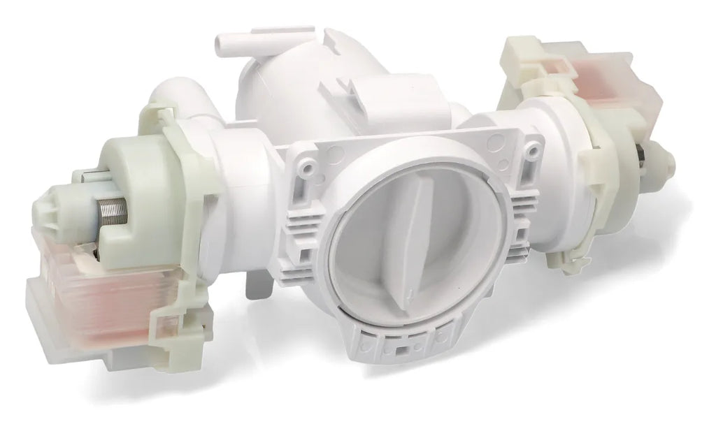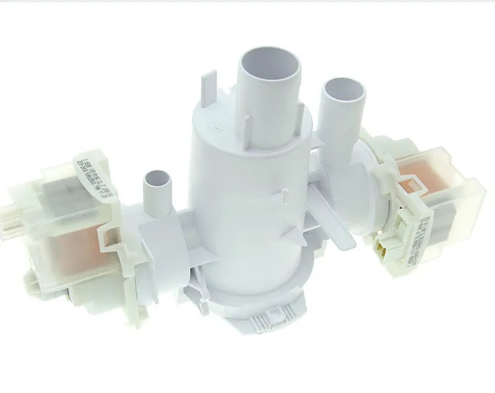 washing machine pump Fagor, Edesa, Aspes. With filter. Double drain and recirculation pump. Tubes Ø 32, 25 and 16 mm. The washing machine pump breaks down when it stops emptying water or when the appliance stops during washing in an emptying phase. Also, sometimes, this fault is preceded by a strange noise when the water is drained from the appliance. Check the condition of the filter periodically to avoid breakdowns.