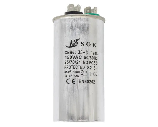 Capacidad de 35µf y 3µf y tensión de trabajo de 450v. Fabricado con materiales metálicos de alta resistencia y durabilidad. Ayuda a mejorar la eficiencia del sistema al proporcionar una fuente de energía estable y constante para el funcionamiento de los componentes del aire acondicionado, incluyendo los motores del ventilador y el compresor.
