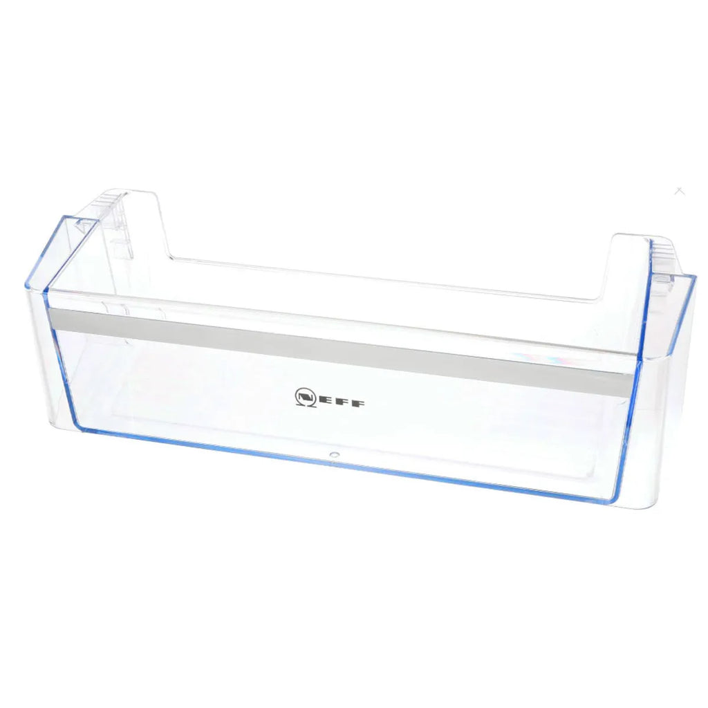 Refrigerator door shelf Neff. Original replacement part for kitchen appliance. This shelf is located in the middle part starting from below the refrigerator door.