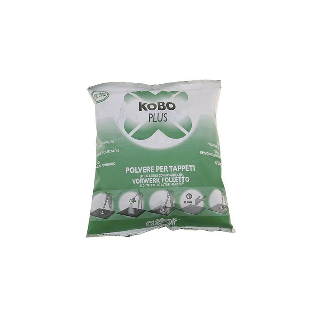 VORWERK-FOLLETTO, VORWERK Polvo para alfombras Kobosan Active Kobo Plus, un producto adaptable diseñado para la limpieza profunda de alfombras y moquetas. Su fórmula con fibras de celulosa natural absorbe la suciedad y el polvo incrustado que la aspiración regular no puede eliminar. Ideal para mantener sus superficies textiles frescas y limpias, reduciendo la formación de alérgenos. Compatible con aspiradoras Vorwerk Folletto y otras marcas. Presentación de 420g, capaz de tratar entre 6 y 8 m² de superficie. Referencias 01082 y 51391.