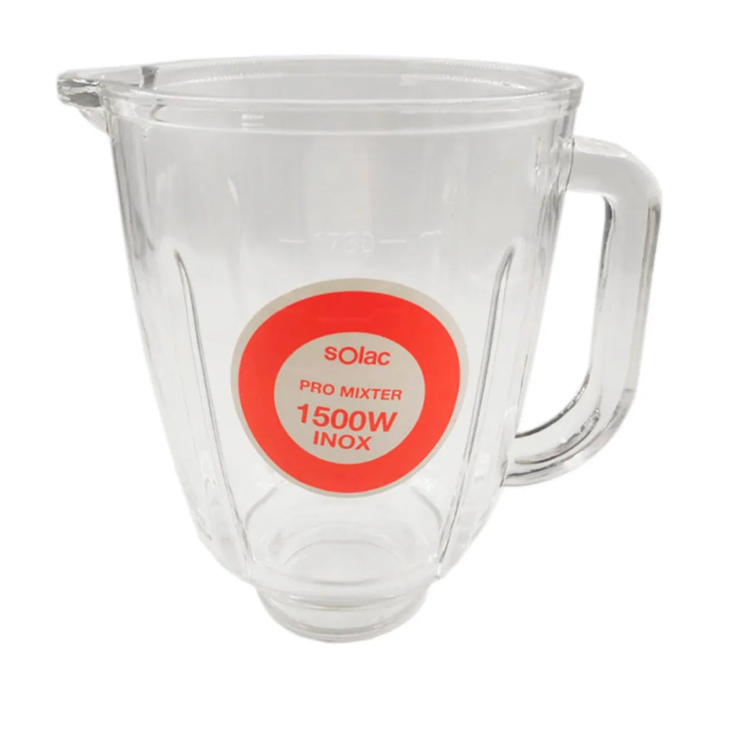 Pro Mixter Inox Solac blender glass. Original replacement for mixer. This part can break due to impacts or sudden changes in temperature. Try to avoid pouring very cold or hot liquids without first adjusting the temperature of the jug.
